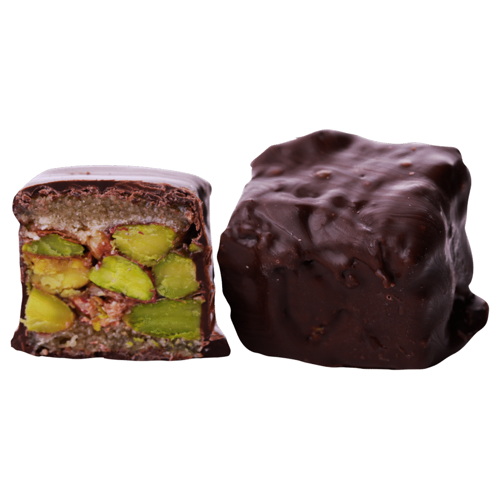 حلوى المبرومة بالفستق الحلبي المغطسة بالشوكولا الداكنه